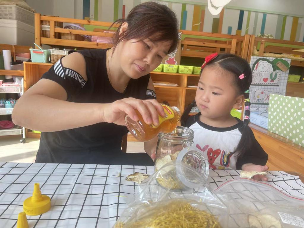 活动中,孩子们在奶奶们的带领下,亲手制作重阳糕,并与爷爷奶奶一起品尝分享,小小重阳糕饱含了孩子们对长辈满满的爱;孩子们一起酿制甜甜的菊花蜜,将自己甜蜜的爱献给长辈们;在妈妈们的陪伴下,宝贝们制作了手工花束和茱萸香囊,一朵朵灵动的花儿、一个个精美的香囊是孩子们无尽的爱意;最后,孩子们不仅为爷爷奶奶献上了自己提前准备好的节目,还为爷爷奶奶捶背、敬茶,一声甜蜜的问候、一个温暖的拥抱,都是孩子们对长辈最真挚的感谢与祝福。