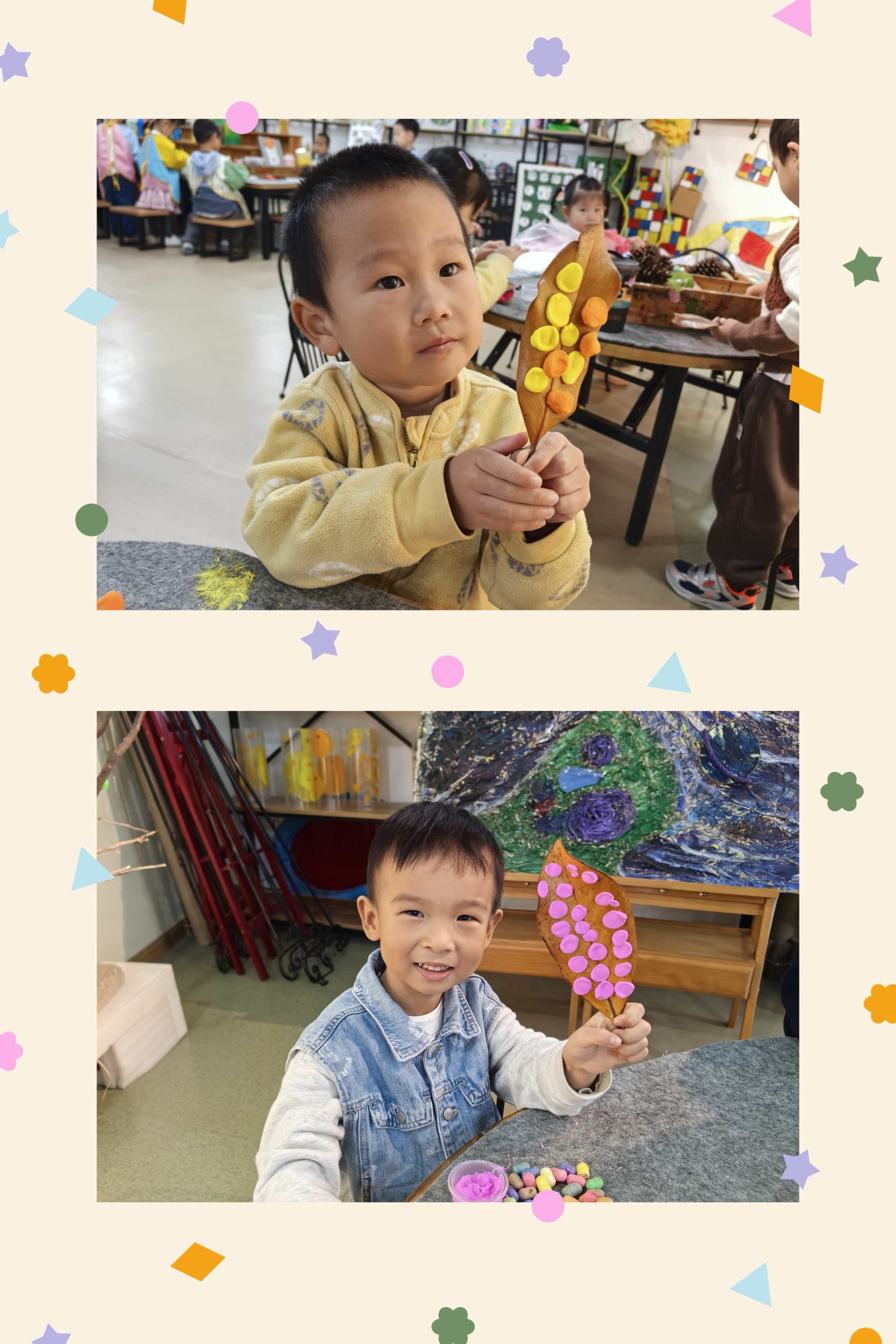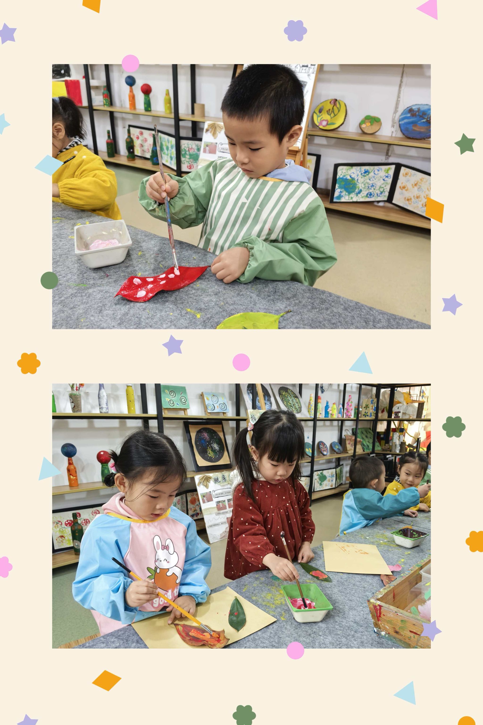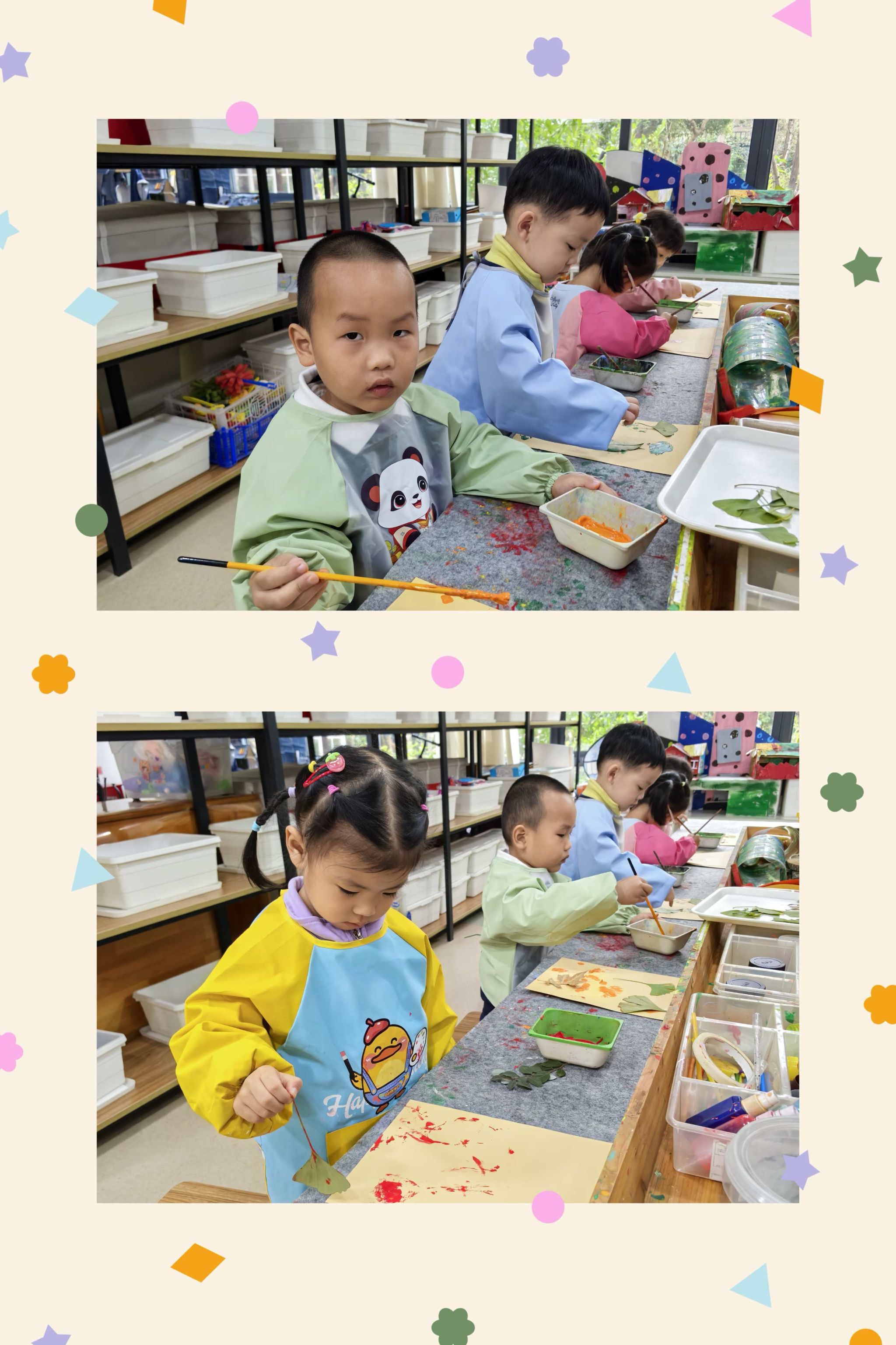 今天我们变成小小艺术家来到画室创作作品,一片片树叶在小朋友的手里赋予了新的灵感,发挥想象大胆创作吧!