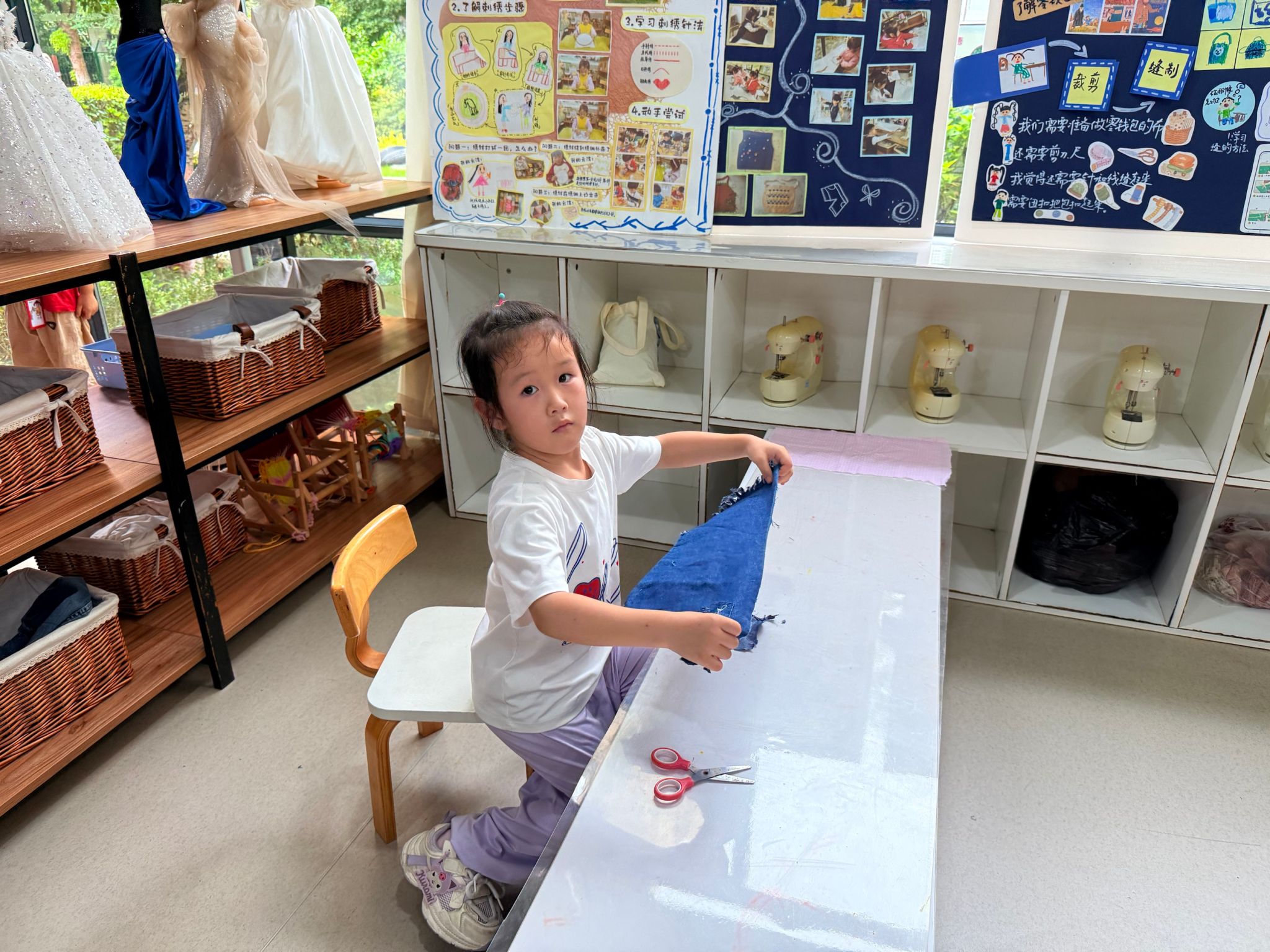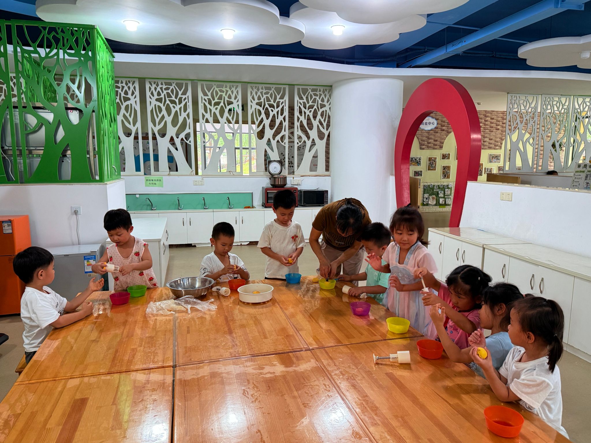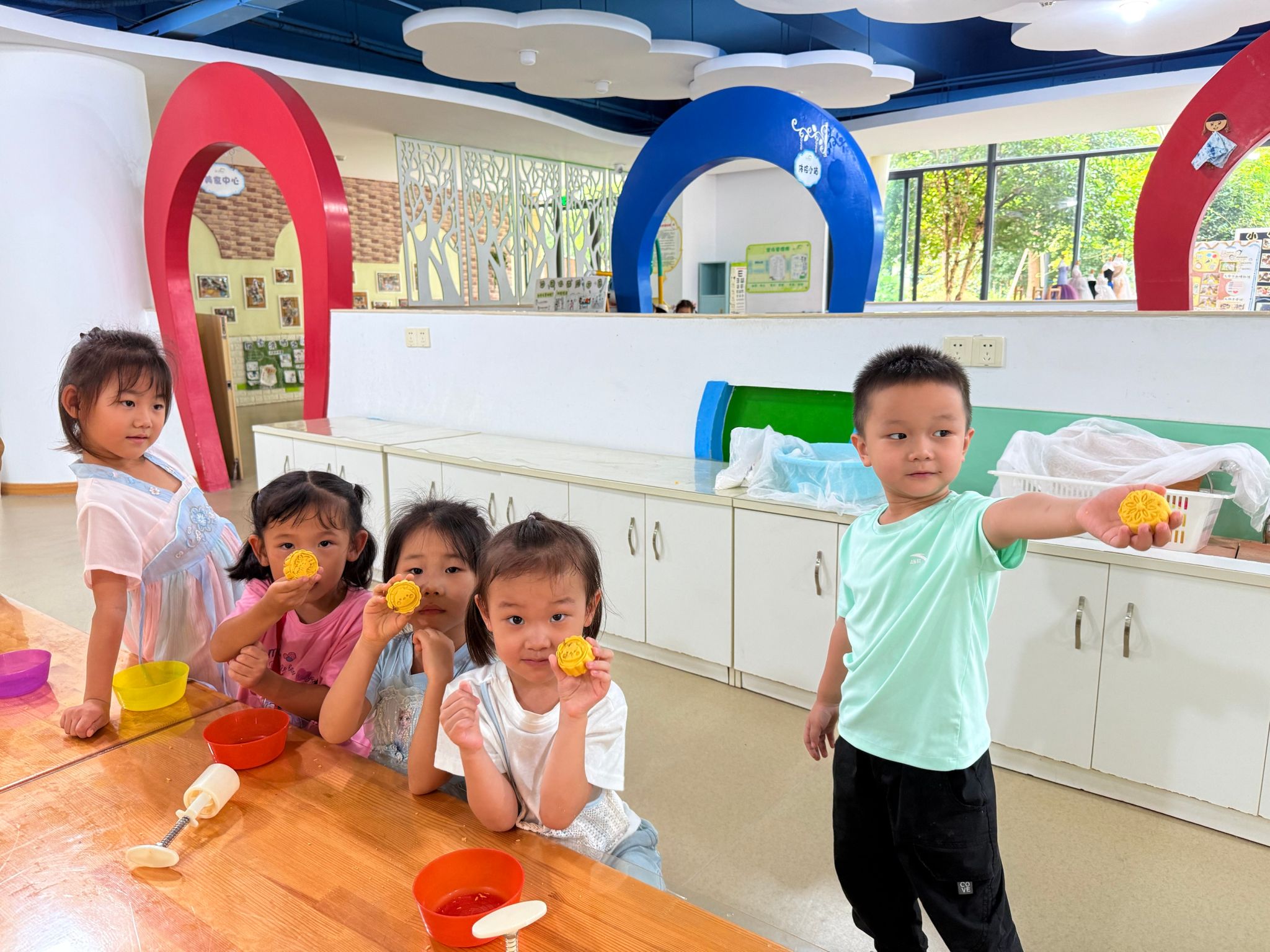今天我们在裁缝中心制作围裙,在体检小站检查身体,还在美食中心做了美味的南瓜月饼。