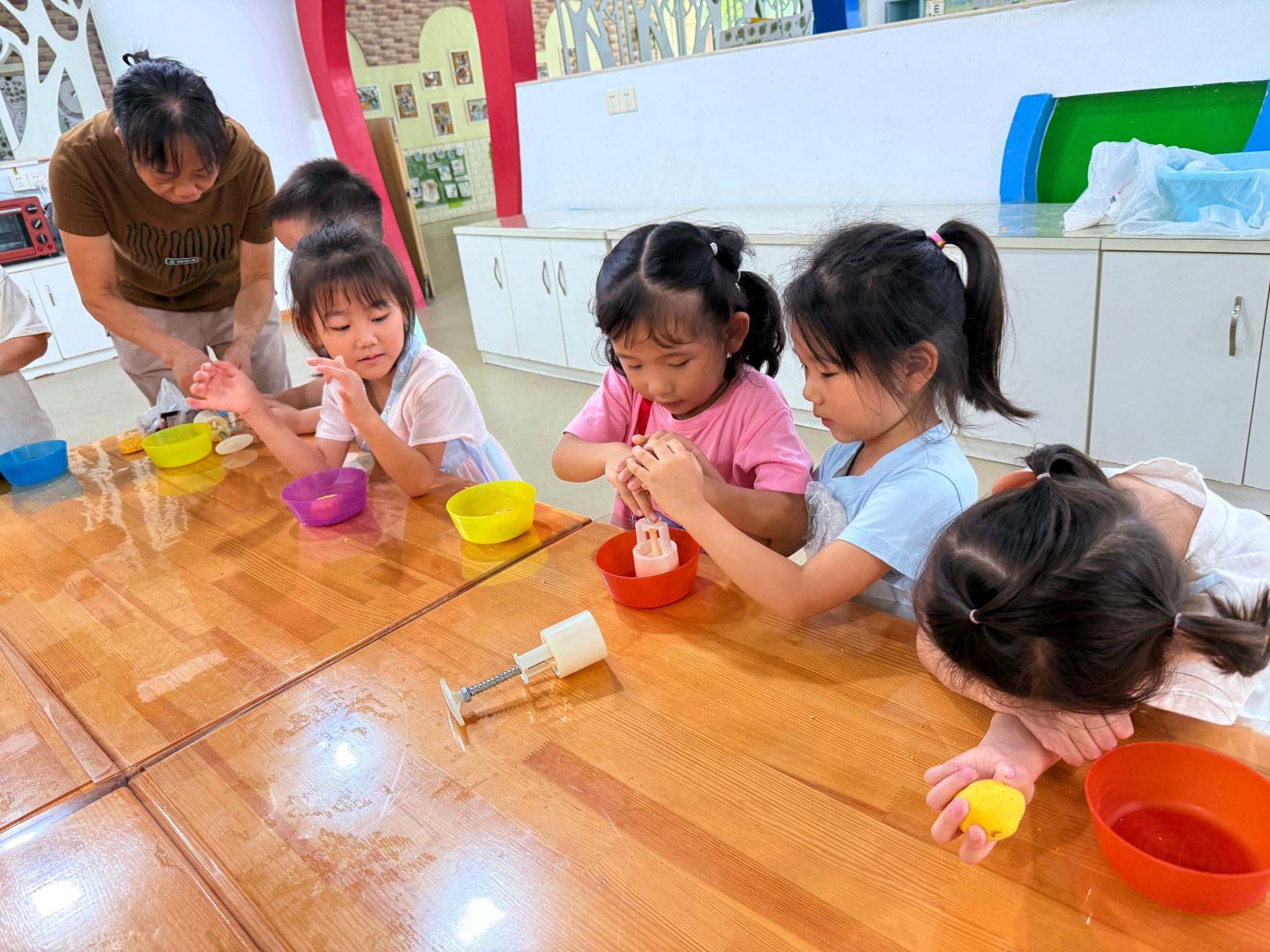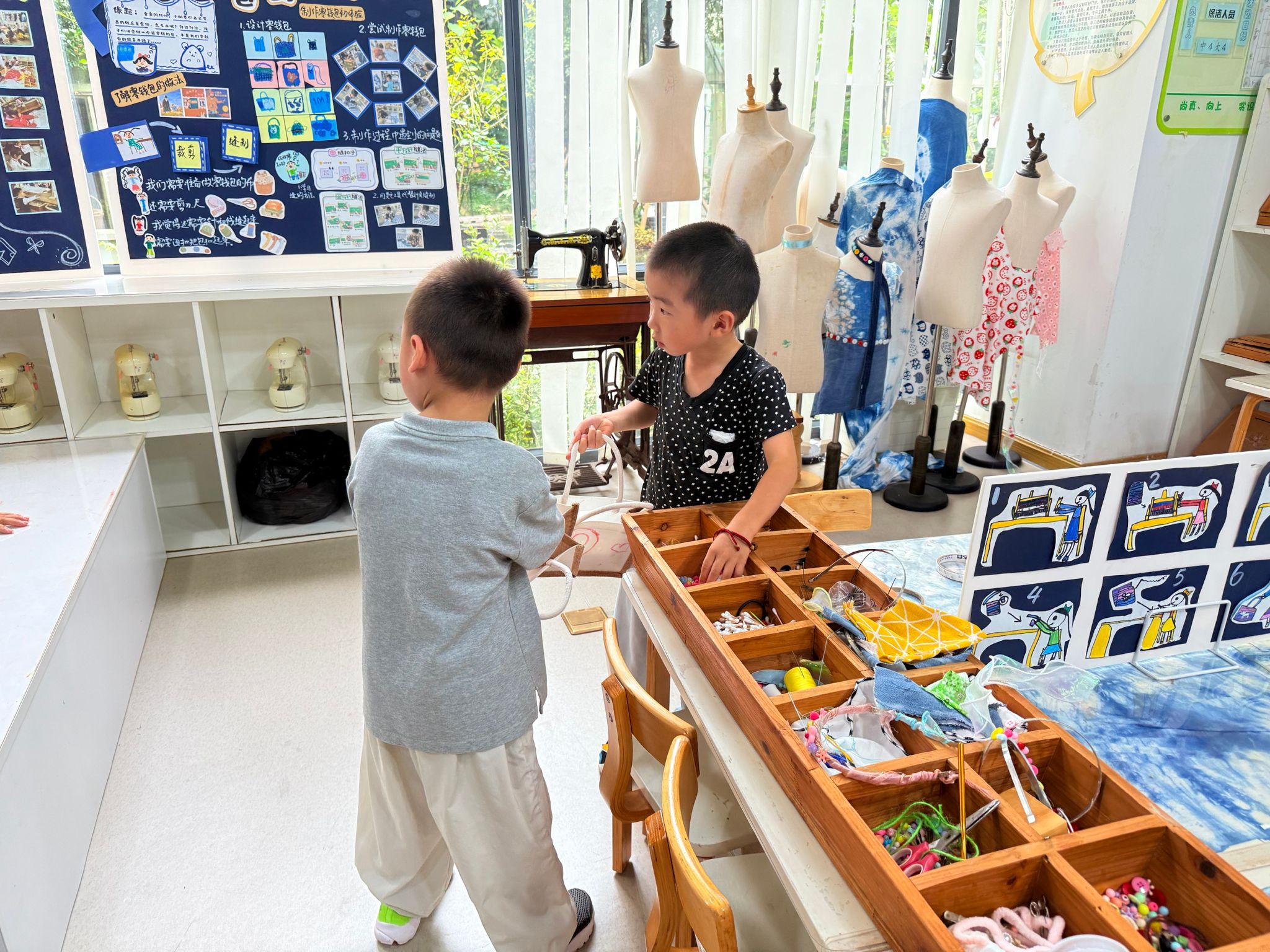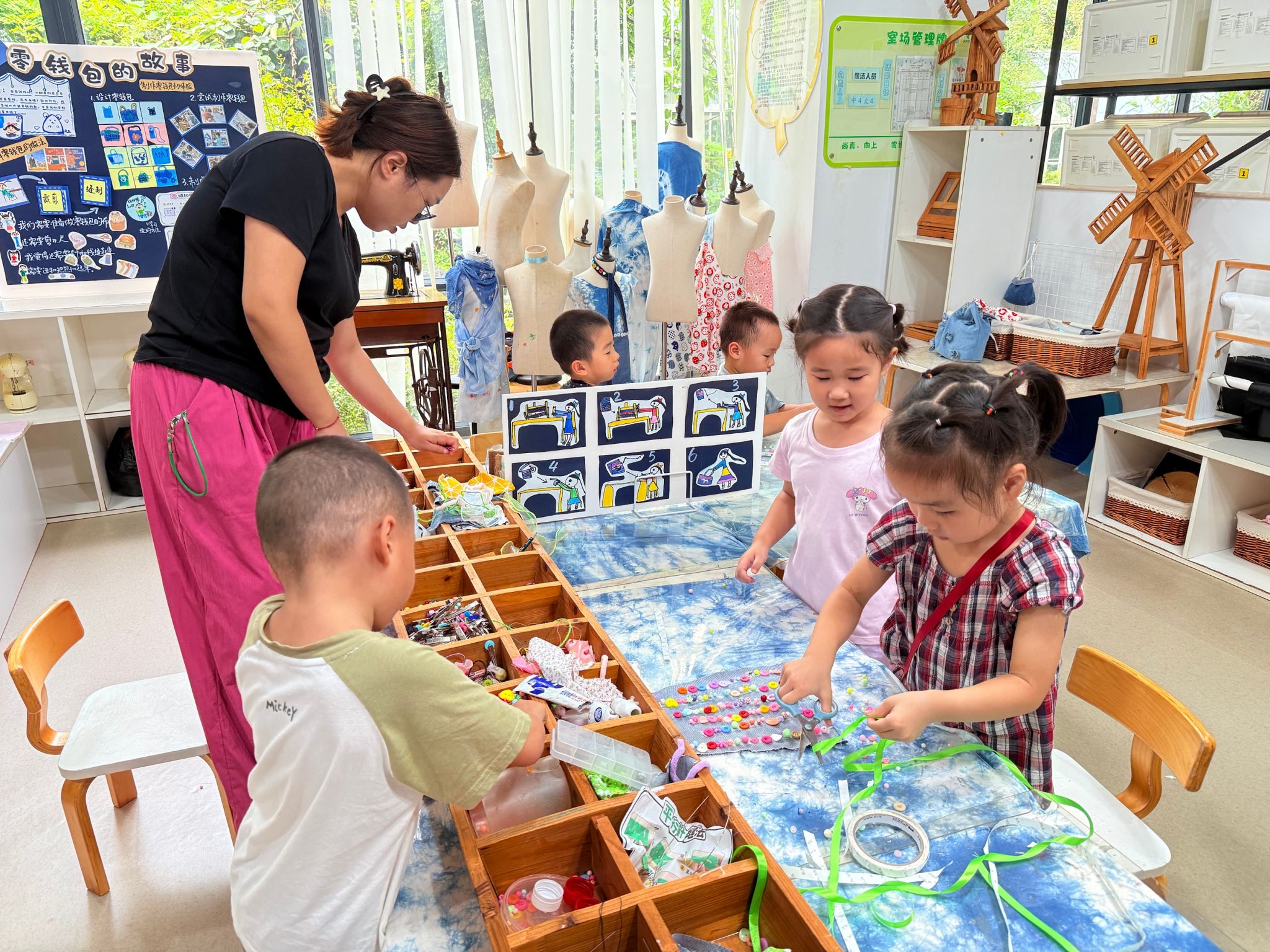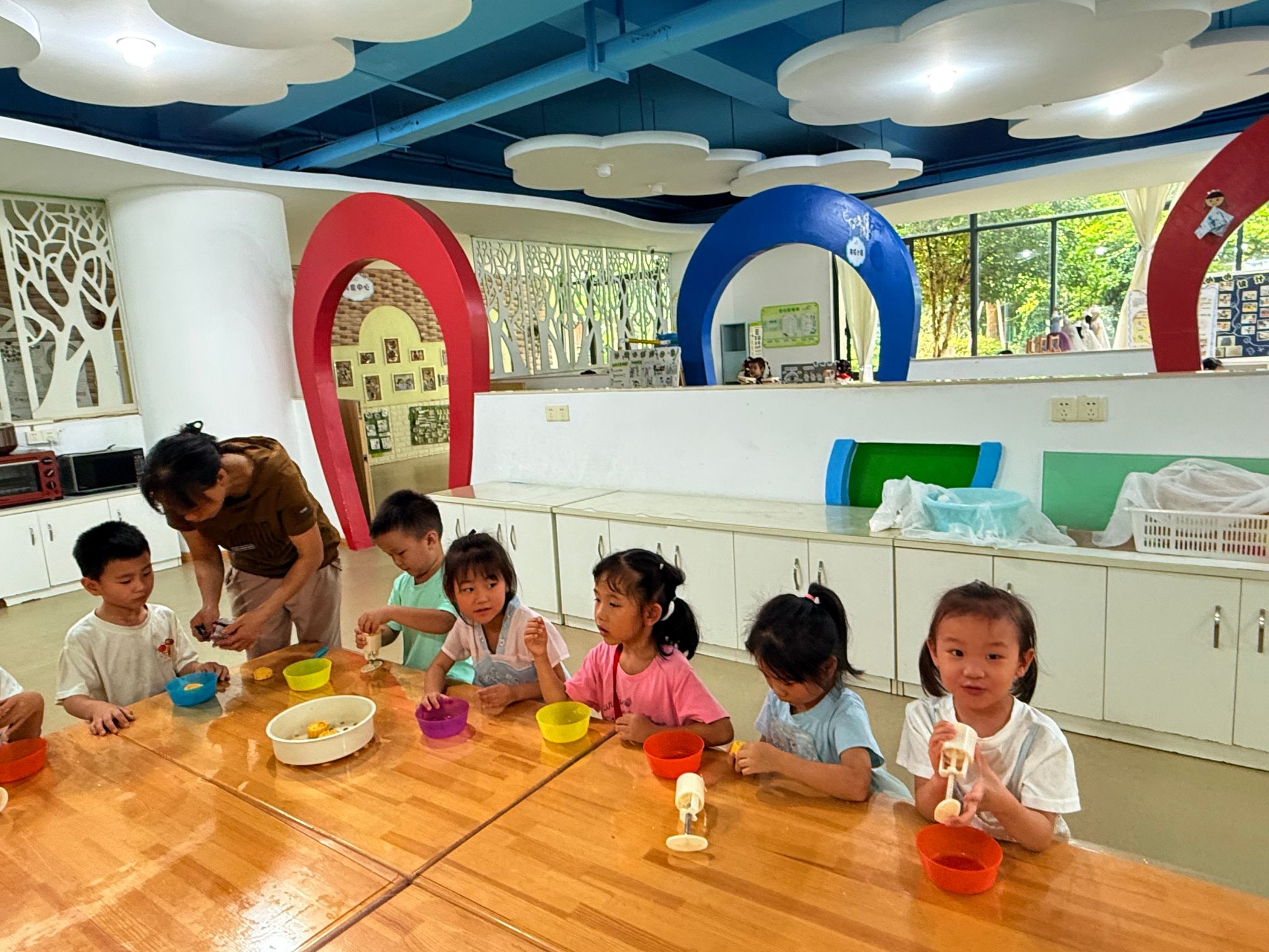 今天我们在裁缝中心制作围裙,在体检小站检查身体,还在美食中心做了美味的南瓜月饼。
