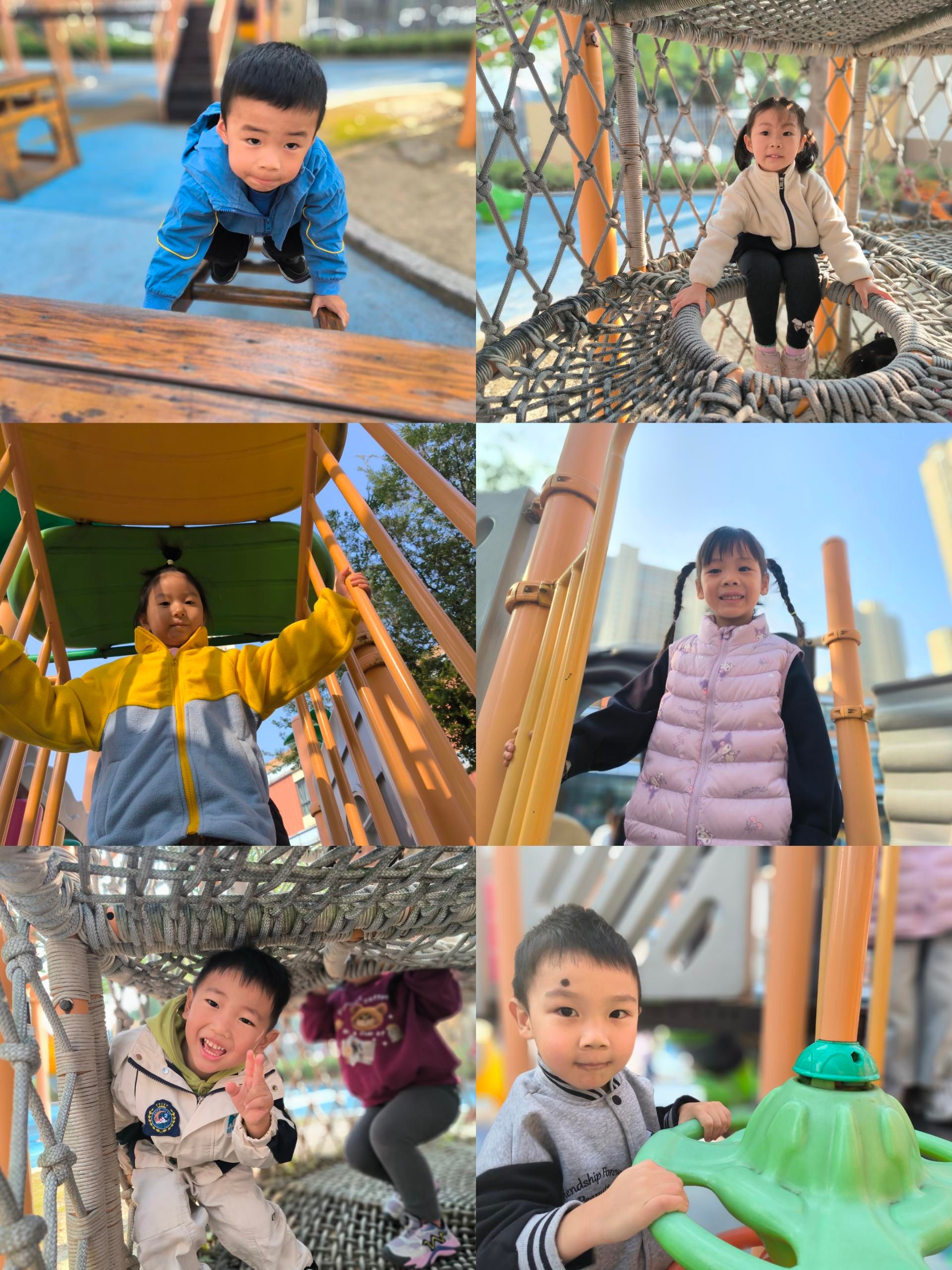 我们在专注地在攀爬架上锻炼肢体力量与平衡感