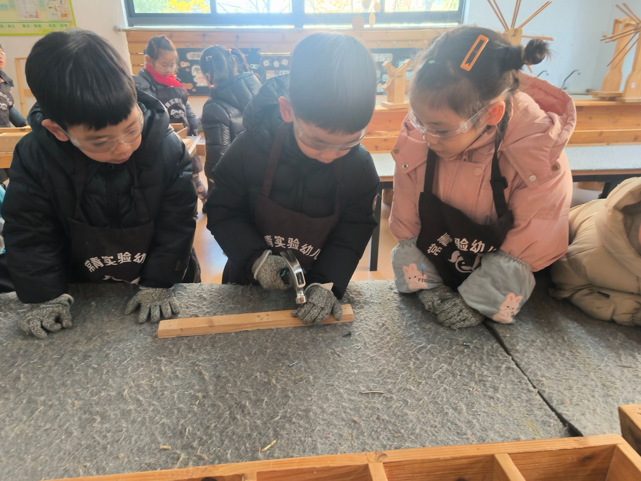 专注地打磨木块、拼接造型