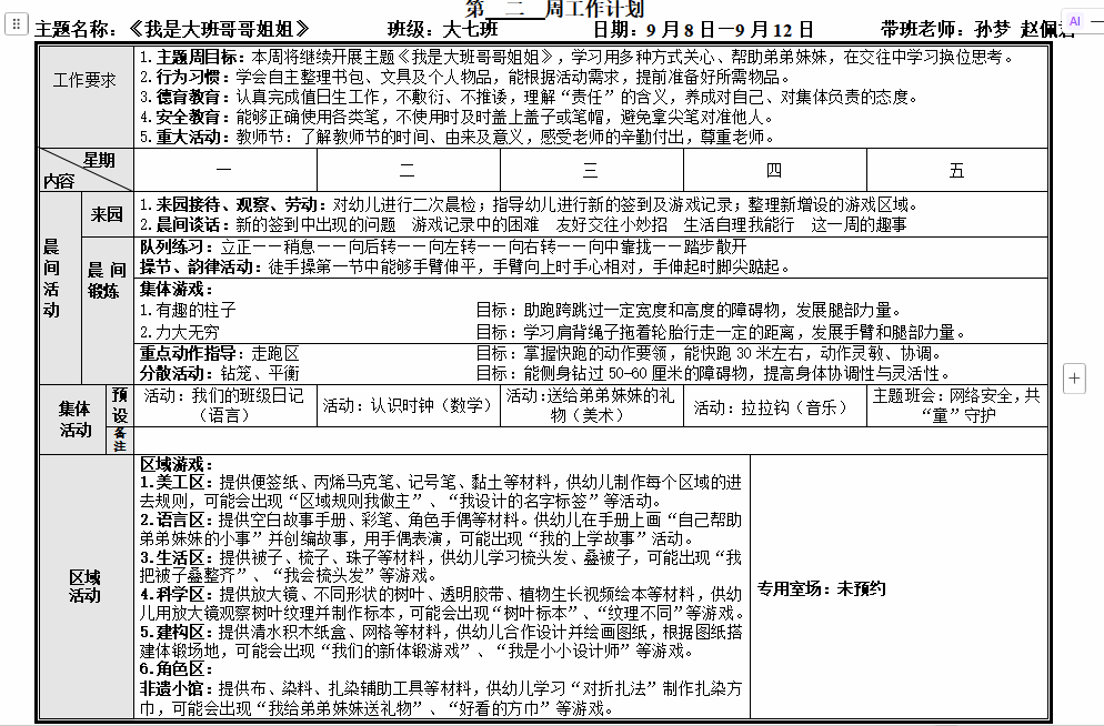 主题计划一:我是大班哥哥姐姐