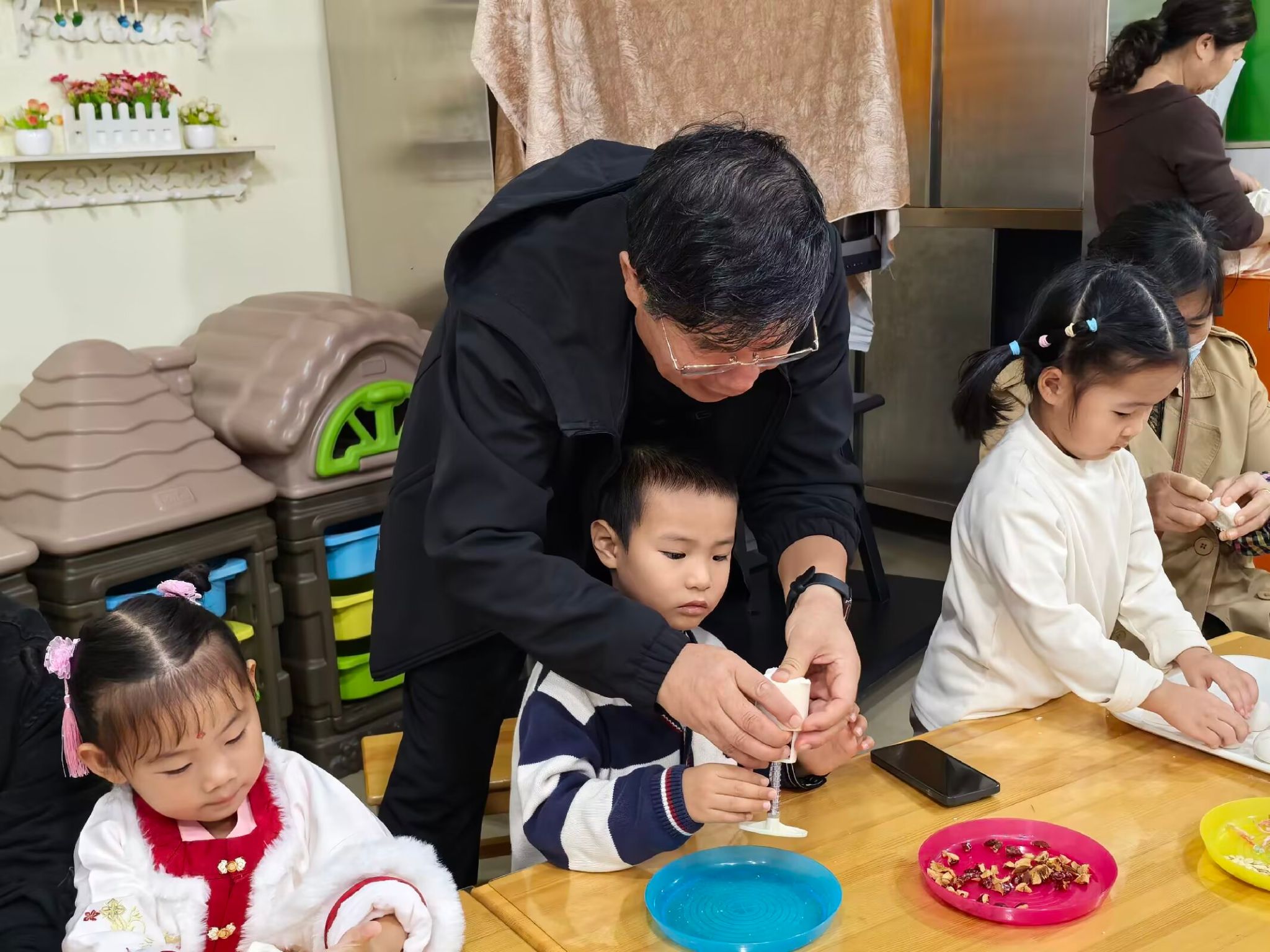 活动开始,通过生动的故事向孩子们介绍重阳节的由来与登高、赏菊、敬老等习俗,引导幼儿理解“重阳敬老”的深层意义;在手工创意环节,孩子们用彩纸、黏土制作出长寿菊、茱萸花等手工作品,每一件作品都凝聚着对长辈的浓浓爱意;最后,我们邀请爷爷奶奶们走进校园,孩子们为长辈们捶背、捏肩、敬茶、做重阳糕,孩子们学着揉面、放料,长辈们耐心指导,揉面的沙沙声、欢快的笑语声在活动室里交织,软糯的糕香里满是祖孙间的温情,更将敬老爱老的传统美德悄然传递。