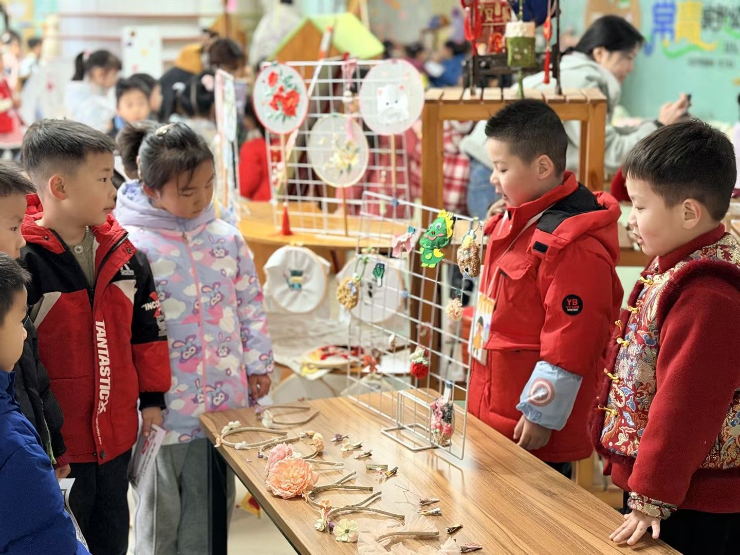 活动前期,孩子们绘制蓝图、创作展品,并设计标识、制作印章;开放日当天,八个班级化为四个主题展馆:自然博物馆、童绣博物馆、线的博物馆和青花博物馆,分别以落叶果实、丝线刺绣、灵动线条和青花笔触展现童趣与创意;孩子们还扮演起“文创设计师”和“金牌售货员”,自制书签、扇子等文创,自信推介,“首席讲解员”们用稚嫩嗓音讲述展品故事,成为亮丽名片;最后,中班幼儿手持邀请函,与大班孩子携手集章打卡,在陪伴中共同成长。