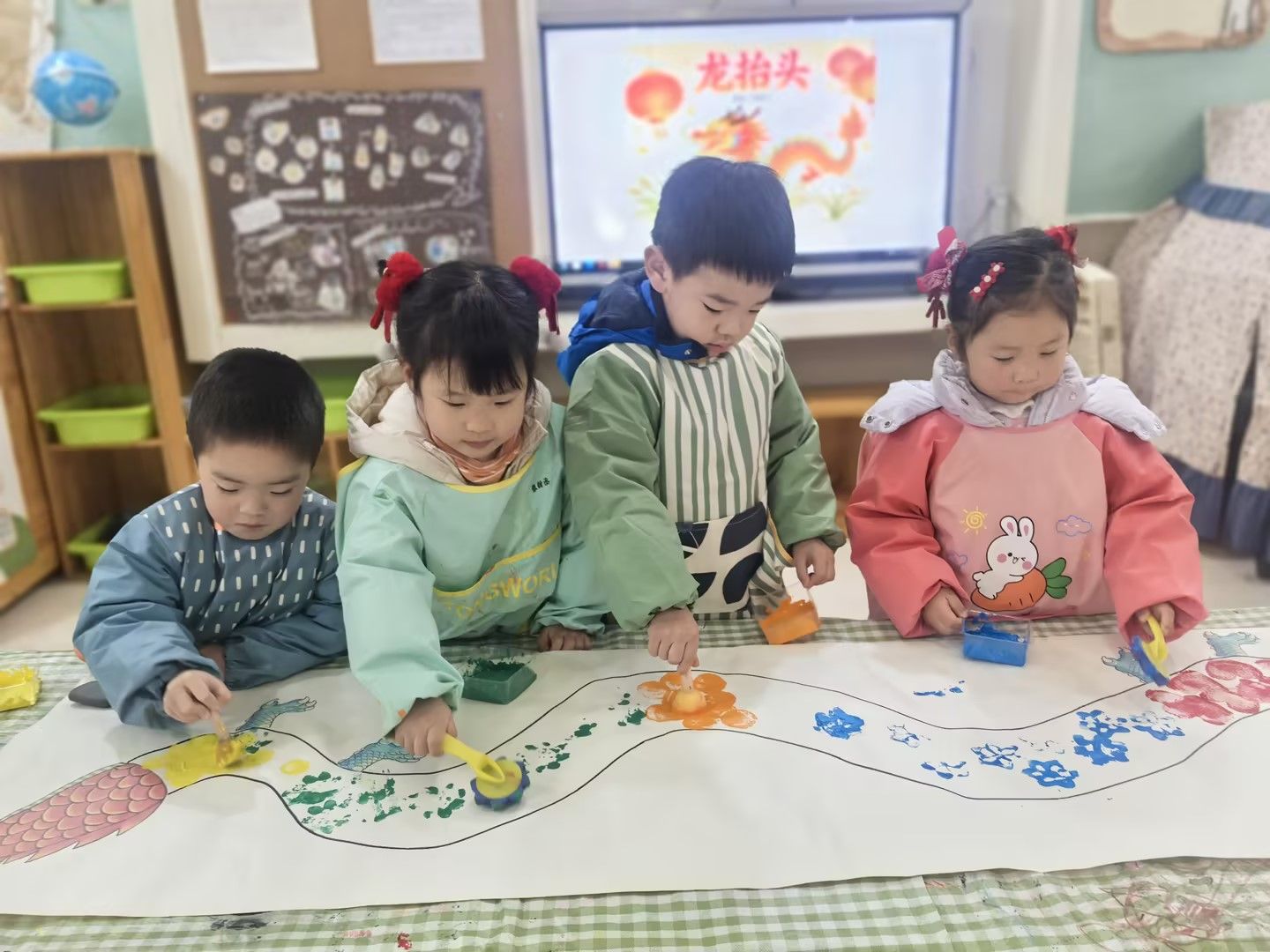 活动中,老师以趣味视频、绘本故事为载体,向孩子们讲解节日由来与传统习俗,让民俗文化走进童心;接着,孩子们化身小艺术家,用画笔、彩纸绘祥龙、贴龙鳞,一条条神气十足的童趣长龙跃然纸上;用黏土、果壳揉捏粘贴,亲手制作寓意健康平安的龙糕,在动手创作中传递美好祝愿;最后,孩子们化身小小美食家,品尝“龙眼”桂圆、“撒金豆”爆米花,在动手制作与快乐分享中品味龙味,体验民俗乐趣。